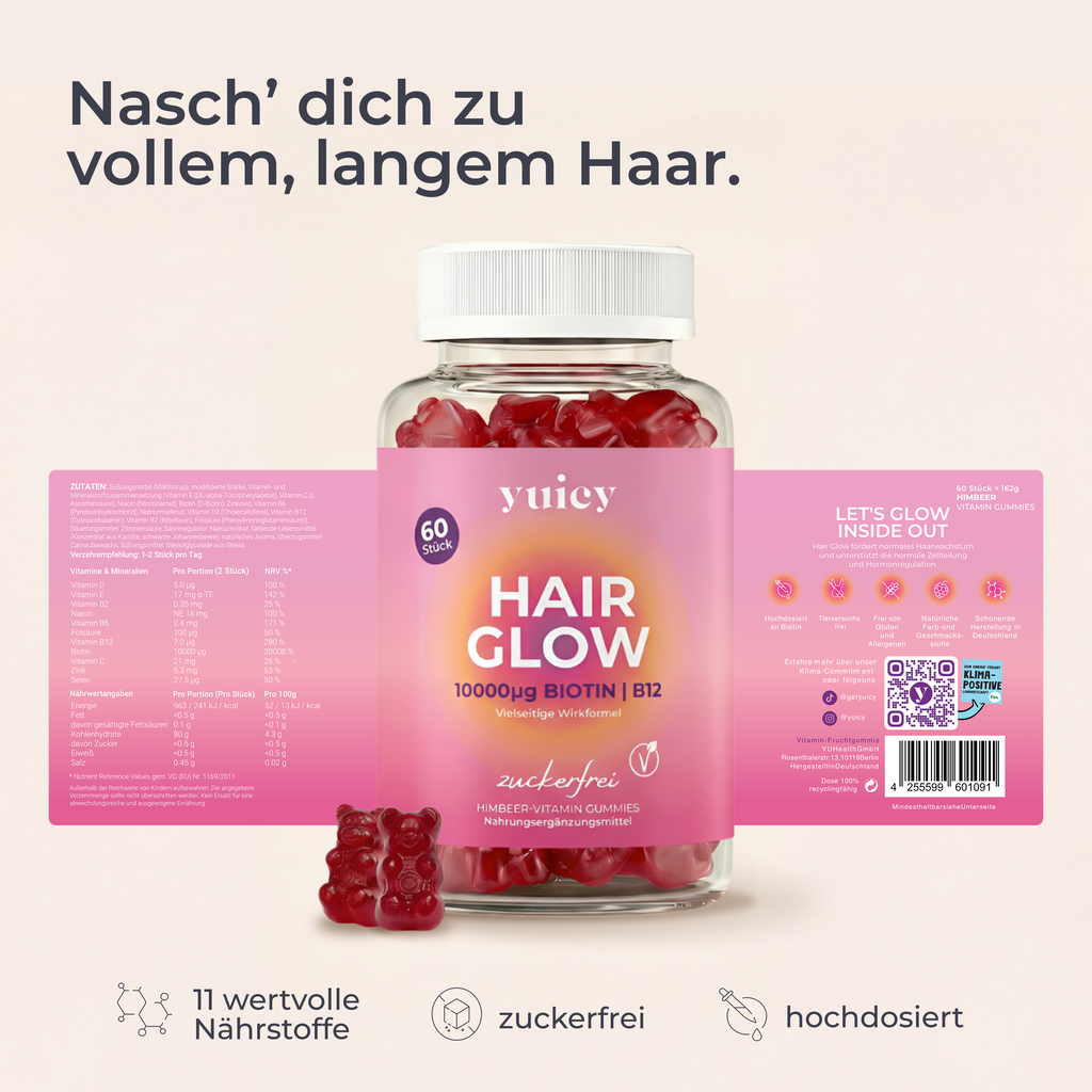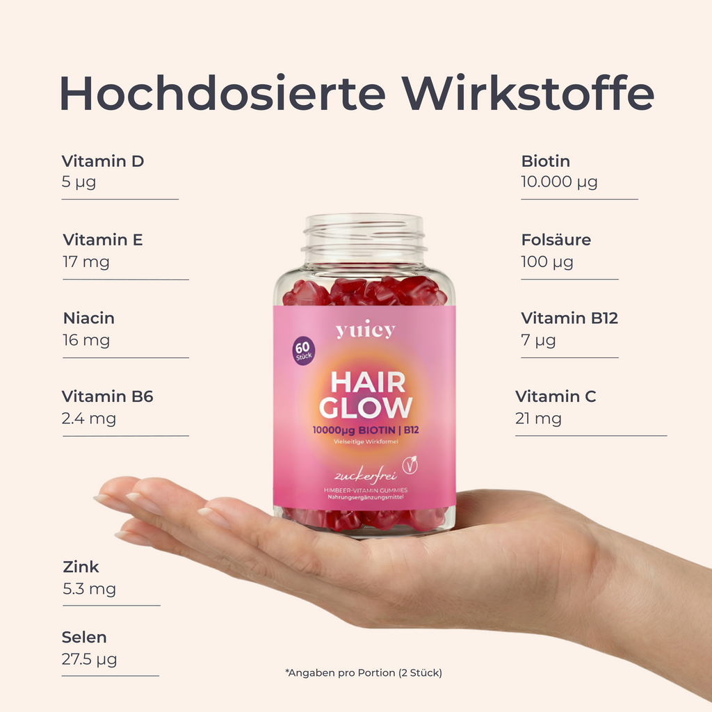 Keratin ist der Hauptbestandteil von Haaren und Nägeln und für die Keratinbildung benötigt der Körper Biotin. Biotin besitzt einen nachweislich positiven Effekt auf das Haarwachstum und lässt das Haar schöner und kräftiger nachwachsen.