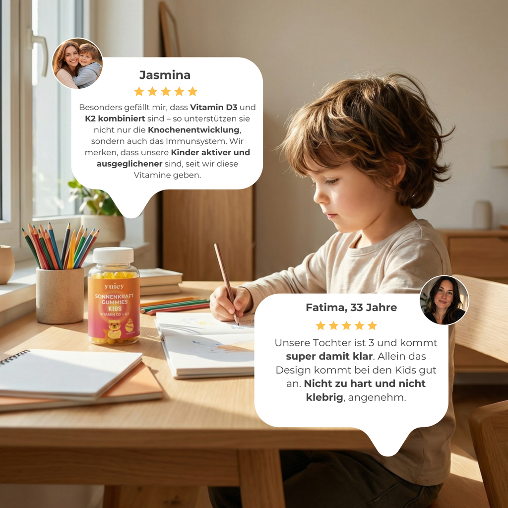 Hey, suchst du nach einer leckeren Möglichkeit, deine Kinder mit den wichtigen Vitaminen für Immunsystem und Knochenwachstum zu versorgen? Dann sind unsere yuicy® Kids Immun Sonnenkraft Gummies die perfekte Lösung für dich und deine Kleinen! 🌟 Diese Vitamin-Gummibärchen sind nicht nur super lecker mit ihrem natürlichen Ananas-Geschmack, sondern auch gesund: Sie enthalten wertvolles Vitamin D3 + K2, die zusammen die normale Funktion des Immunsystems unterstützen und zu starken Knochen beitragen. Sie sind für Kids ab 2 Jahren geeignet und unterstütze Abwehrkräfte, Knochen & Calcium-Balance! Hol dir jetzt deine Packung yuicy® Kids Immun Gummies!
